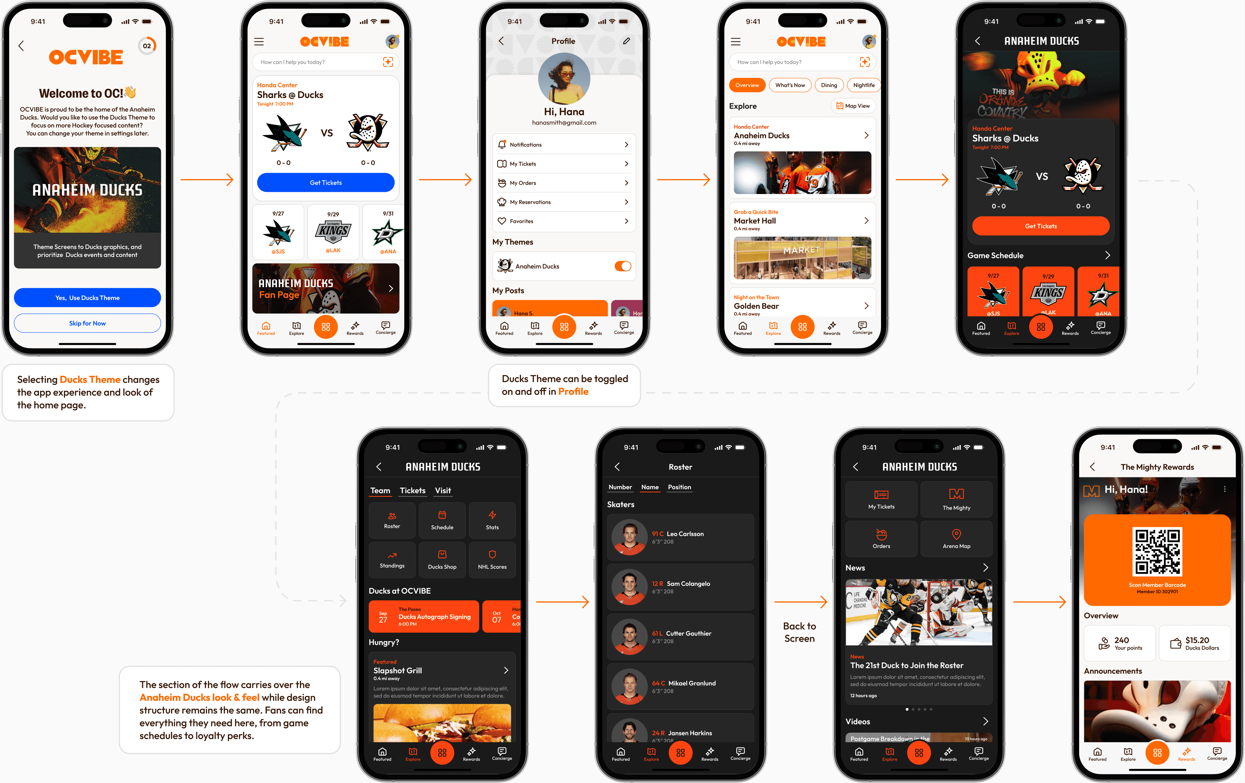 To serve the district’s core fanbase, I designed an integrated ' Anaheim Ducks Mode' that shifts the app’s content priority. Users can opt-in during onboarding to access a dedicated team hub. This specialized experience carries over the Ducks' look and feel across game schedules, rosters, and loyalty perks, while maintaining the app’s underlying structure.